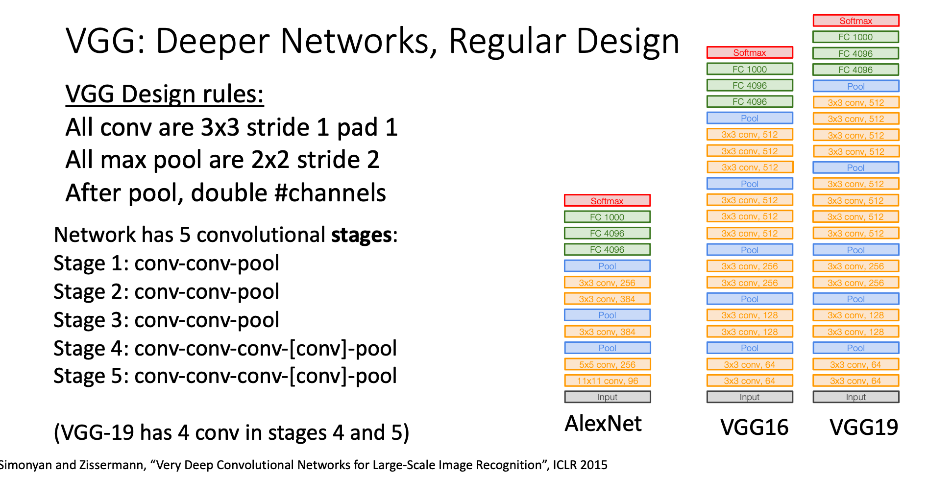 VGG network consists of 5 stages, each of them is made up of several Conv layer with filters and a max pooling layer