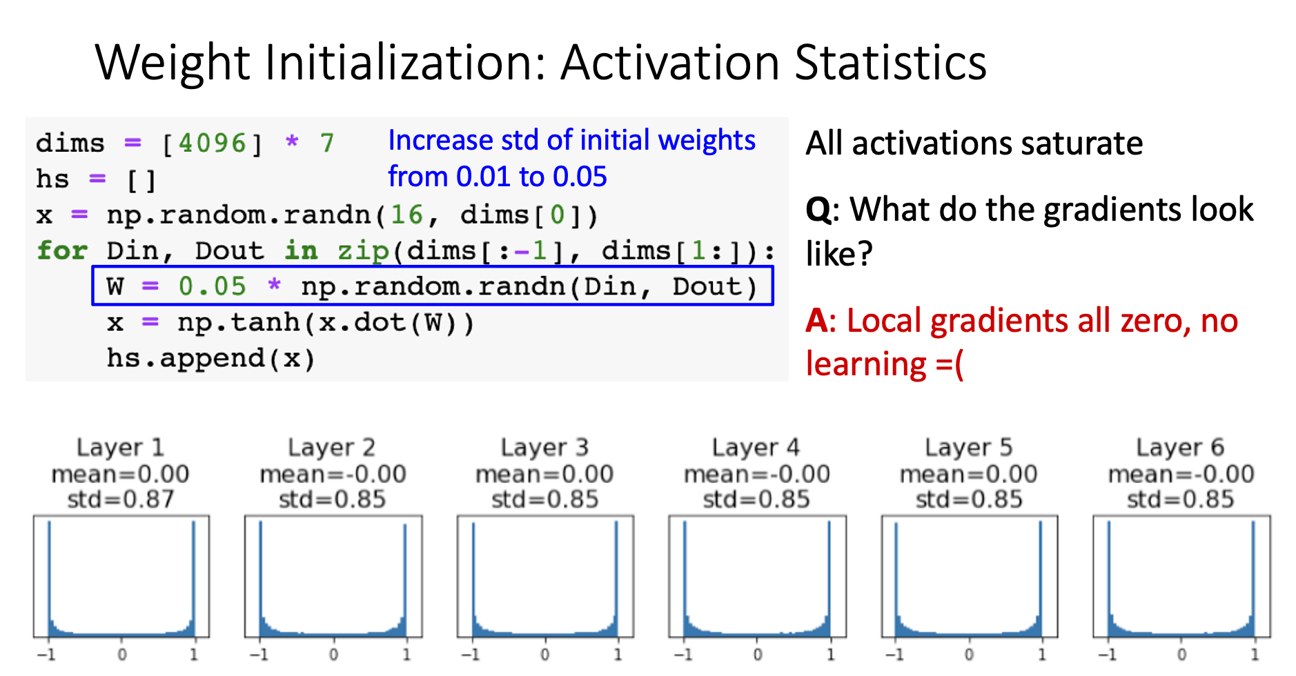 Problem chain: Weight large → Layer output large → Activations saturate at ±1 → Next layer input large → Repeat…