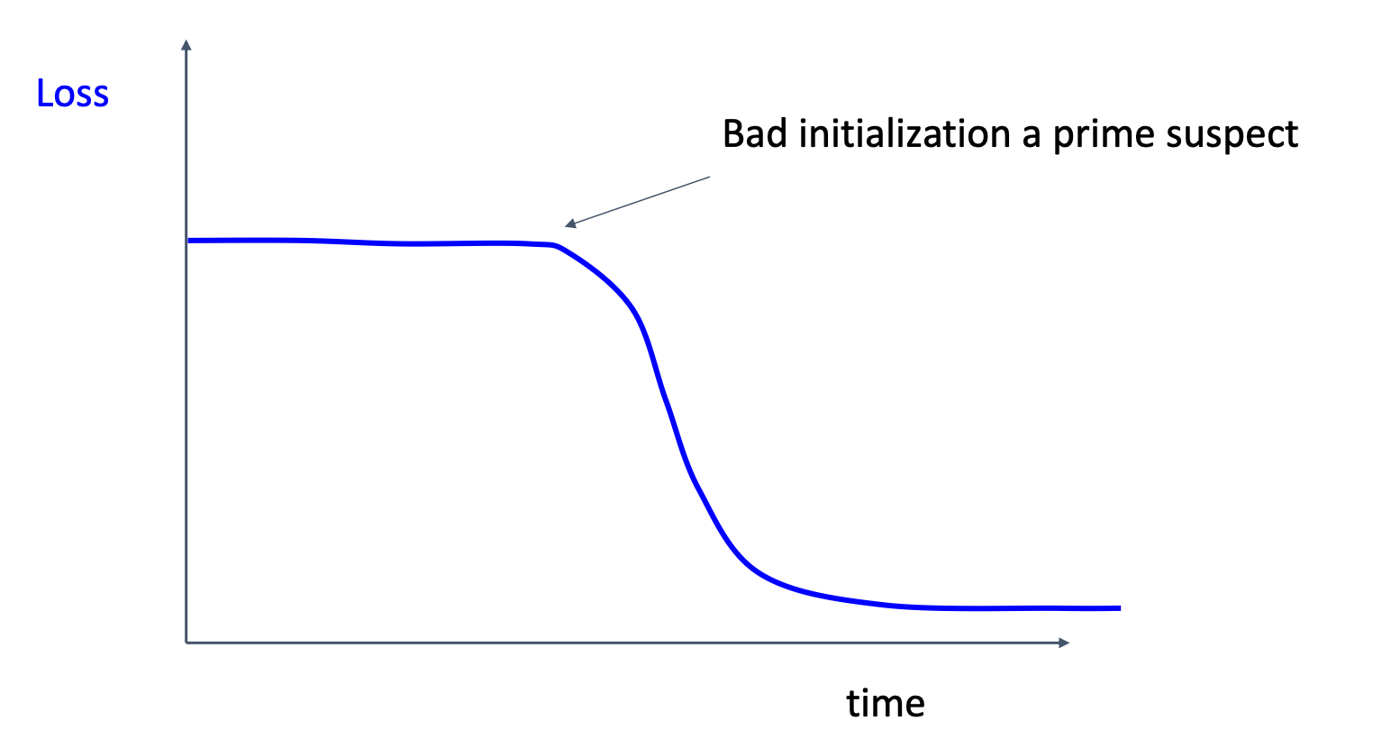 This may happen because we initialize the weights near regions where gradients are zero