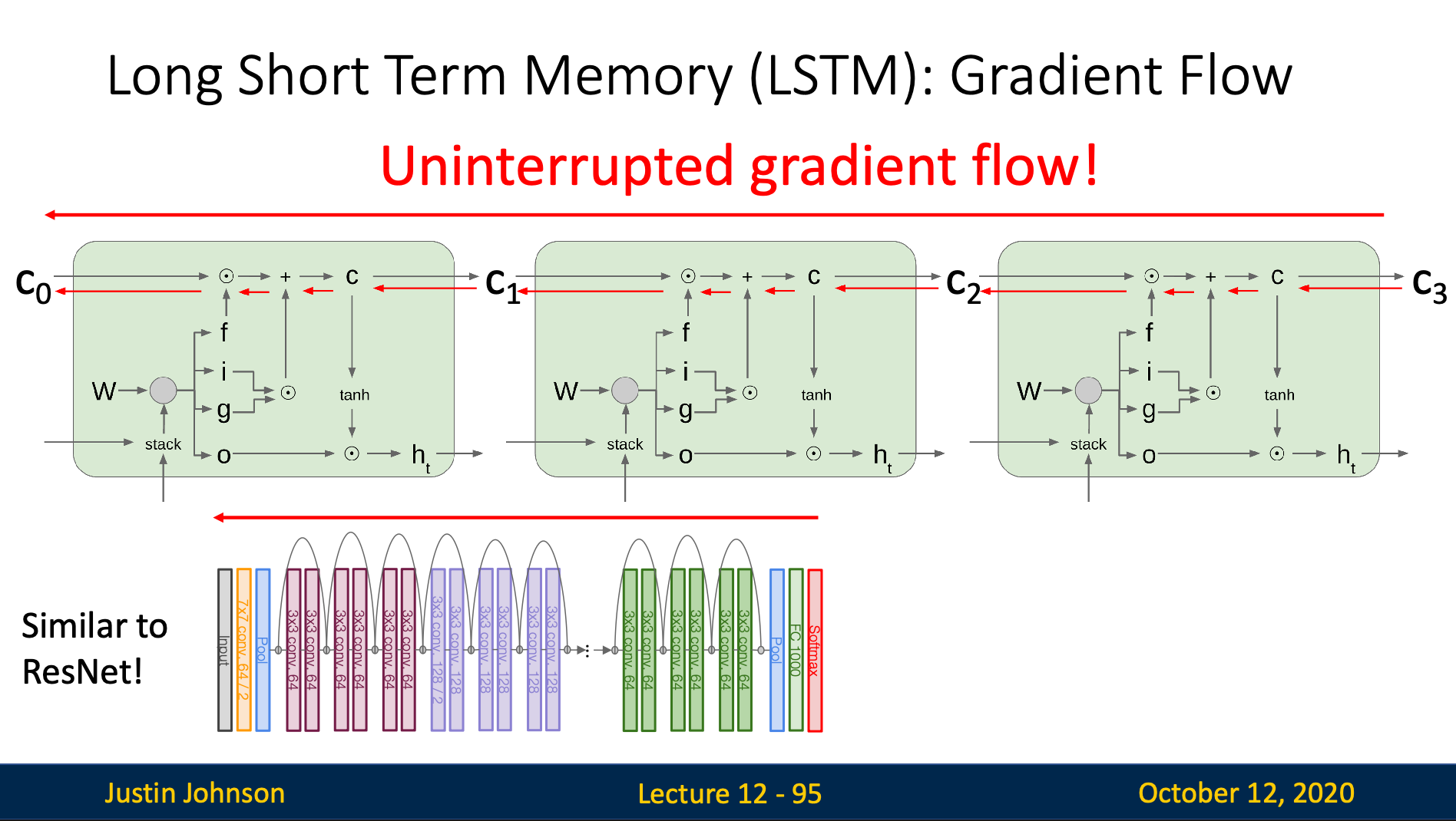 By observing the slide above, we can observe that the backward pass path only go through an addition and an element-wise matrix multiplication, which both don’t destroy information of the gradient flowing backward