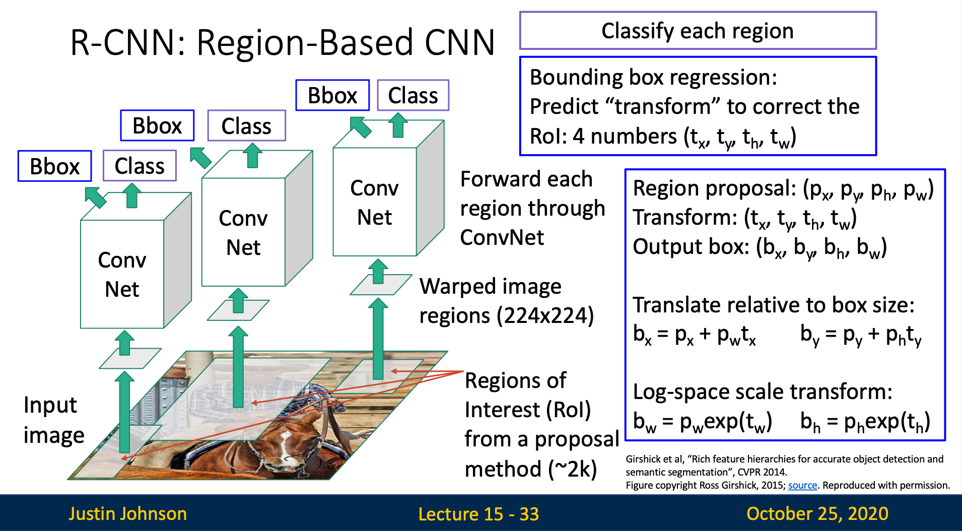 Resize each region to size of CNN’s input, then pass them through CNN to predict class scores and bounded box transform