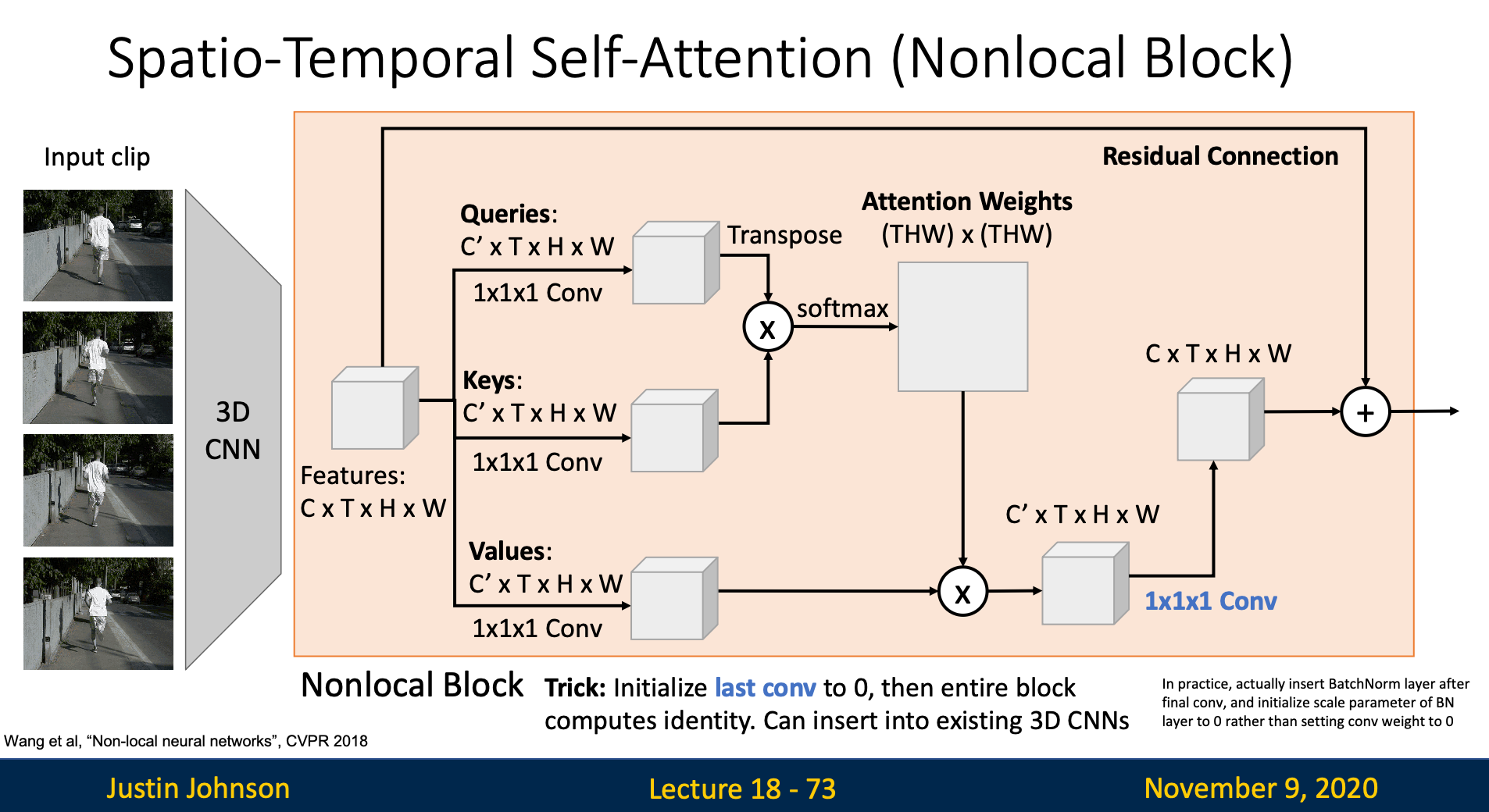 If we initialize the last convolution to zero, then the entire block computes identity in default. Hence, we can insert self-attention layer between layers in 3D CNN