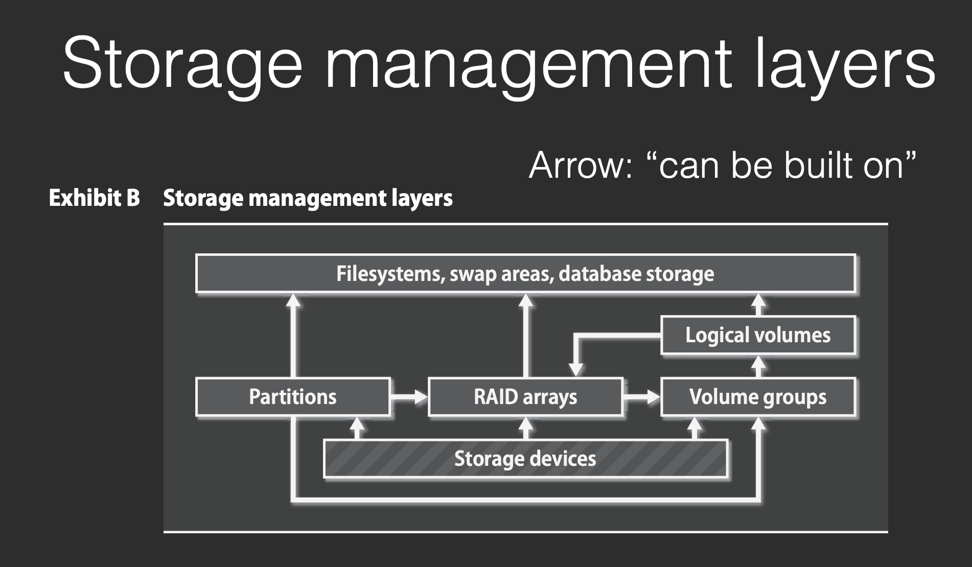 最底層的實際硬體,包括傳統硬碟、SSD等儲存媒體。作業系統將這些表示為裝置檔案(如 /dev/sda)