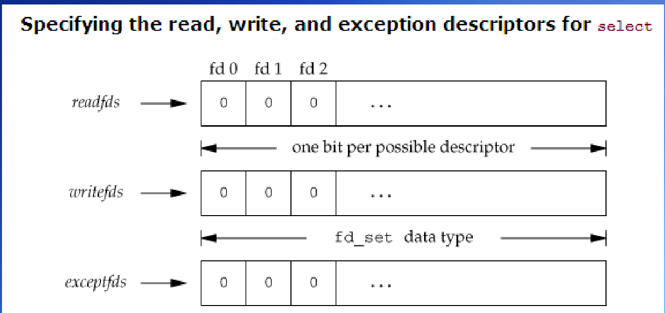totalFds = select(nfds, readfds, writefds, errorfds, timeout)nfds- the range of file descriptors to checkreadfds- a bit map, set bit to check whether file descriptor is ready for readingwritefds- set bit to check whether file descriptors is ready for writingerrorfds- bit map to check for errorstimeout- how long to wait before stop blocking the processtotalFds- number of ready descriptors, 0 for timeout, negative for error