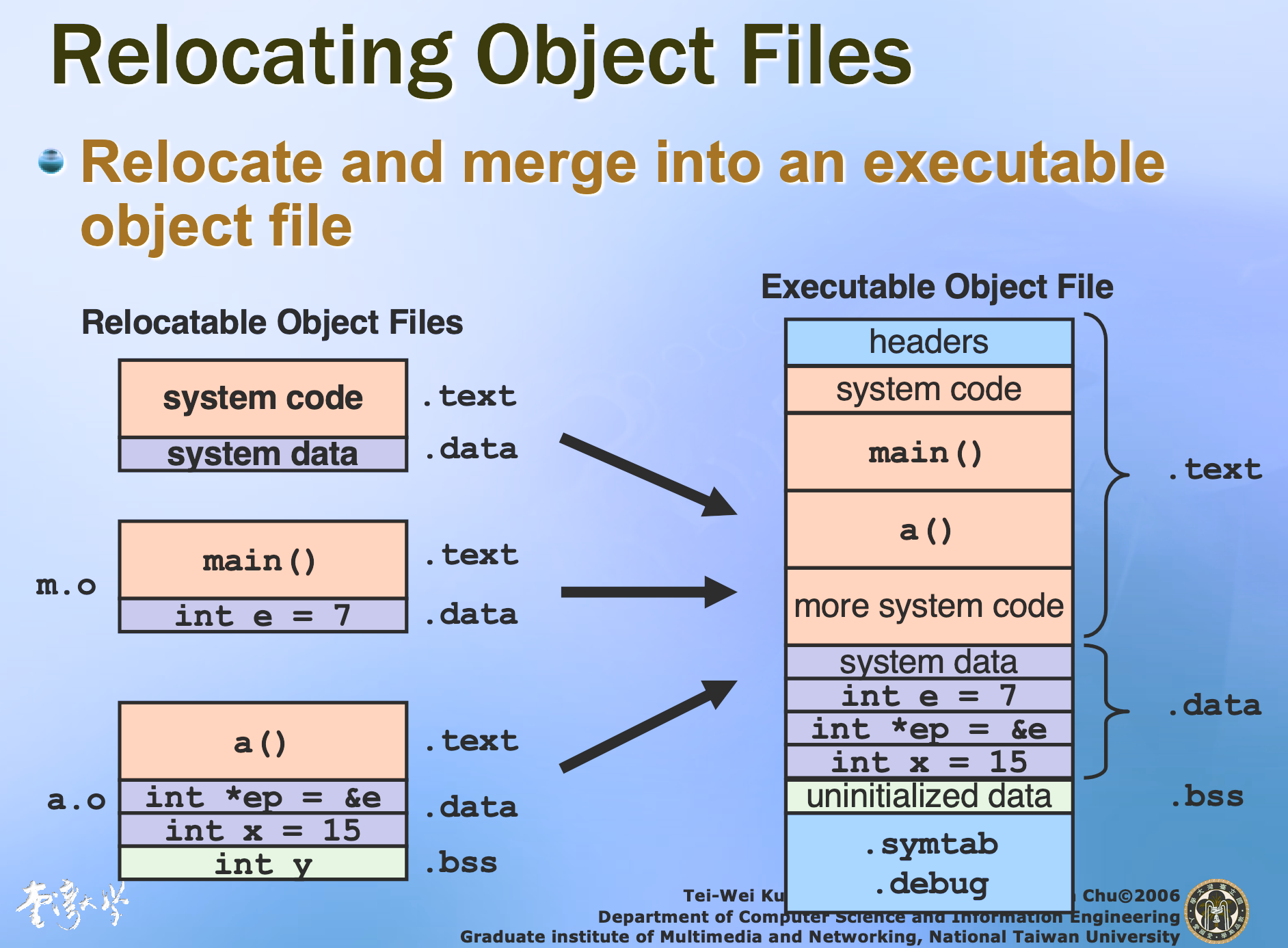 Executable object file 是最終可執行的程式檔案(Linux 無特定副檔名,Windows 為 .exe),由連結器整合多個 relocatable object files 和函式庫而成。所有符號引用已完成解析,程式碼和資料都配置在固定的虛擬記憶體位址,作業系統可直接載入執行。