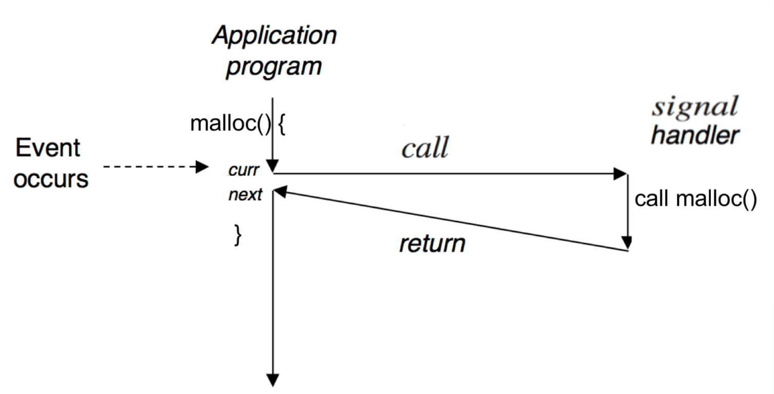 - 假設我們正在跑 Function A 然後突然被 signal interrupt 並且去跑 signal handler 並且這個 signal handler 也呼叫了一次 Function A