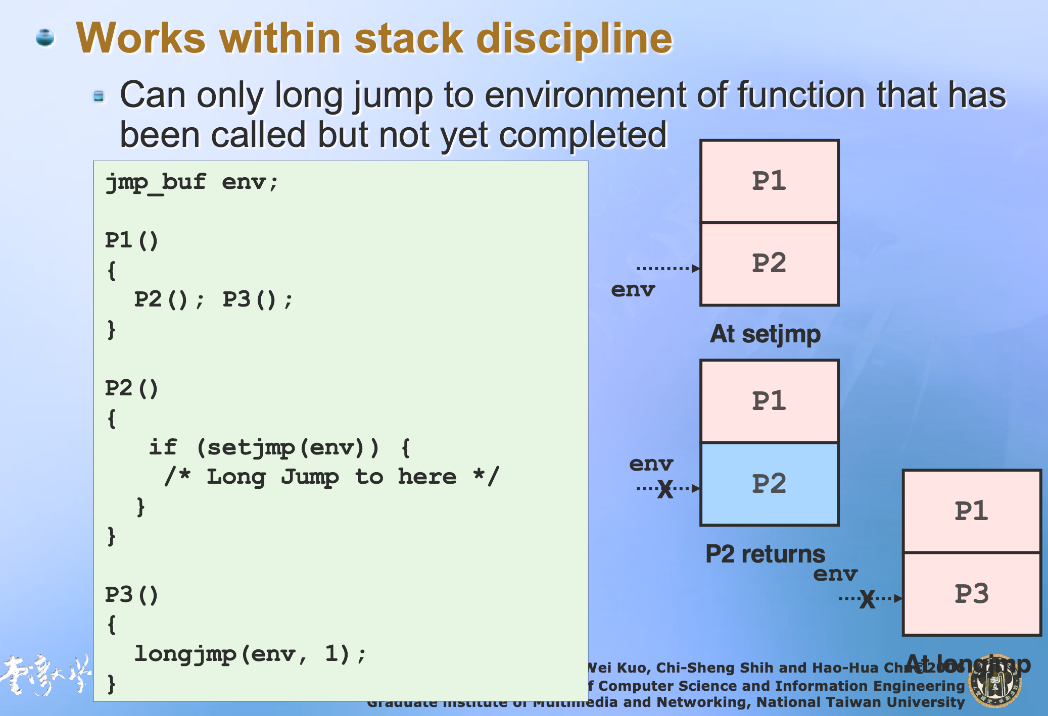 Nonlocal jump 允許你從一個函數內直接跳到另一個函數,而不用遵守正常的 calling 和 return 程序